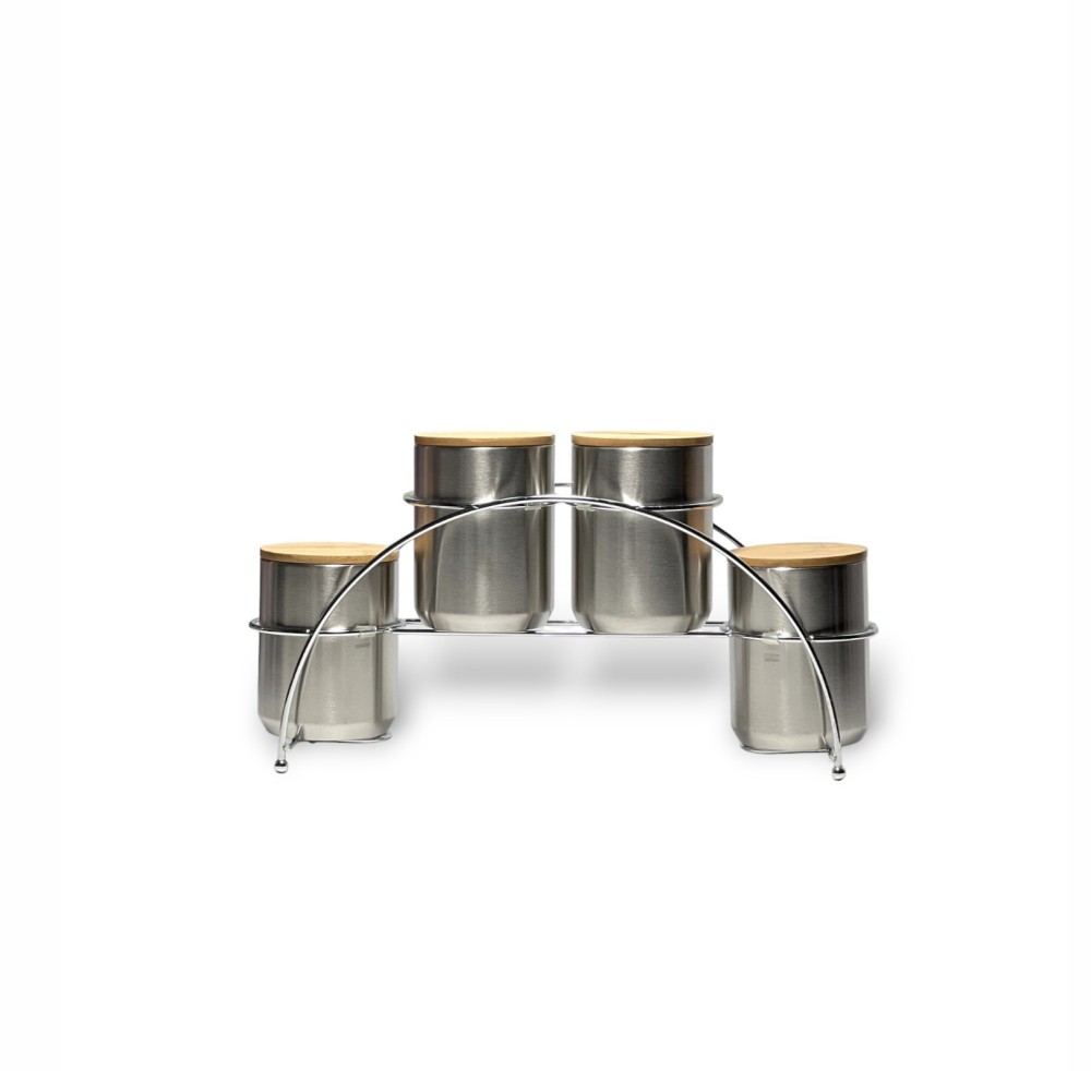 طقم علب توابل مع ستاند 4 علبة من الاستالس استيل مقاوم للصدا بشكل انيق و راقي بلون الاستيل الفضي