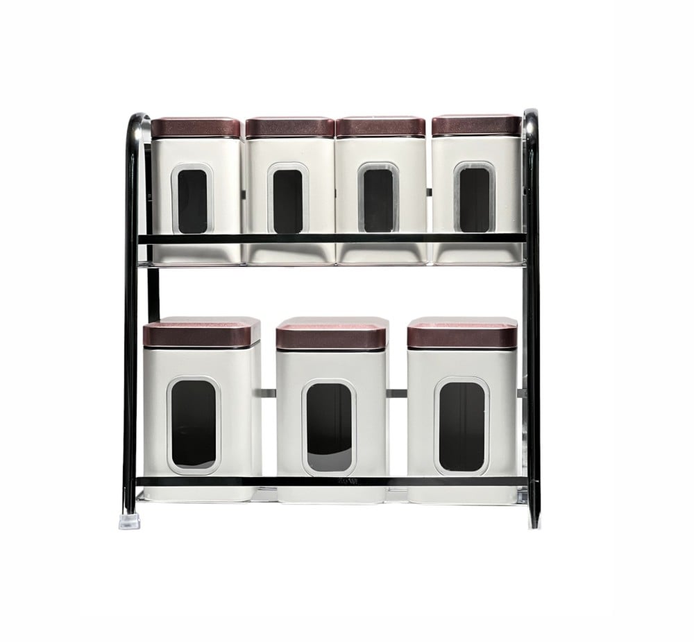 طقم علب توابل مع ستاند 7 علبة من الاستالس استيل مقاوم للصدا بشكل انيق و راقي بلون الأبيض